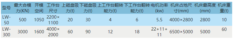 LW系列五金合模机是我公司针对五金模具专业推出的新型合模机,采用电永磁盘快速锁住模具,可以不用上紧固螺丝,下工作台可移出并可实现90度翻转,上工作台也可实现180度翻转落下放平,全电脑人机界面操作,简单、快捷、安全可靠,从而大大提升加工效率。已获国家专利(专利号:ZL200820206324.0)。