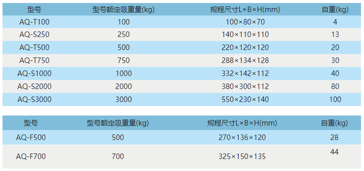 AQ系列精品磁吊以磁性大、刚性好、操作精巧、安全性高,以及造型美观等众多优点,被誉为磁吊中的精品,已获国家专利,专利号为:02363209.7与02817395. AQ普通型磁吊